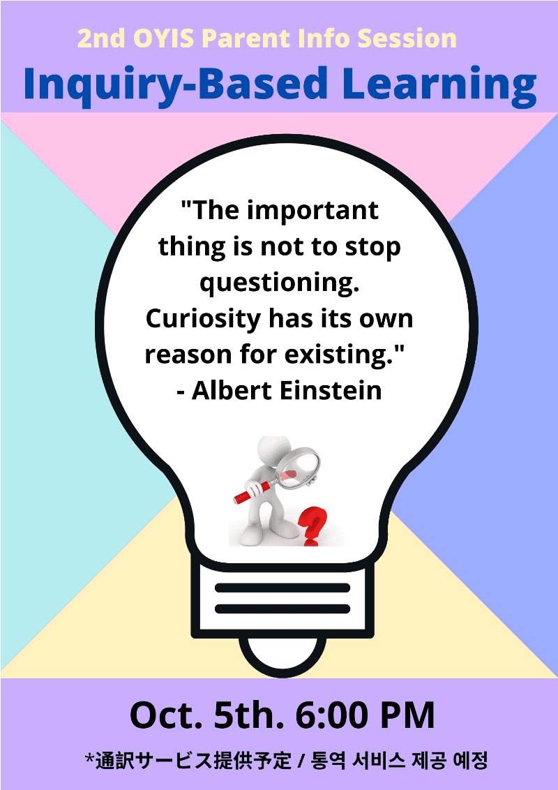Our Parent Info Session “Inquiry Learning” is on Oct 5th! We have our PYP Coordinator, Mr. O’Leary and Vice Principal Mr. Duex as a presenter. Please come and join us to support your child better together. 通訳サービス提供予定 / 통역 서비스 제공 예정 Video recording here: PYP Info session Inquiry Learning